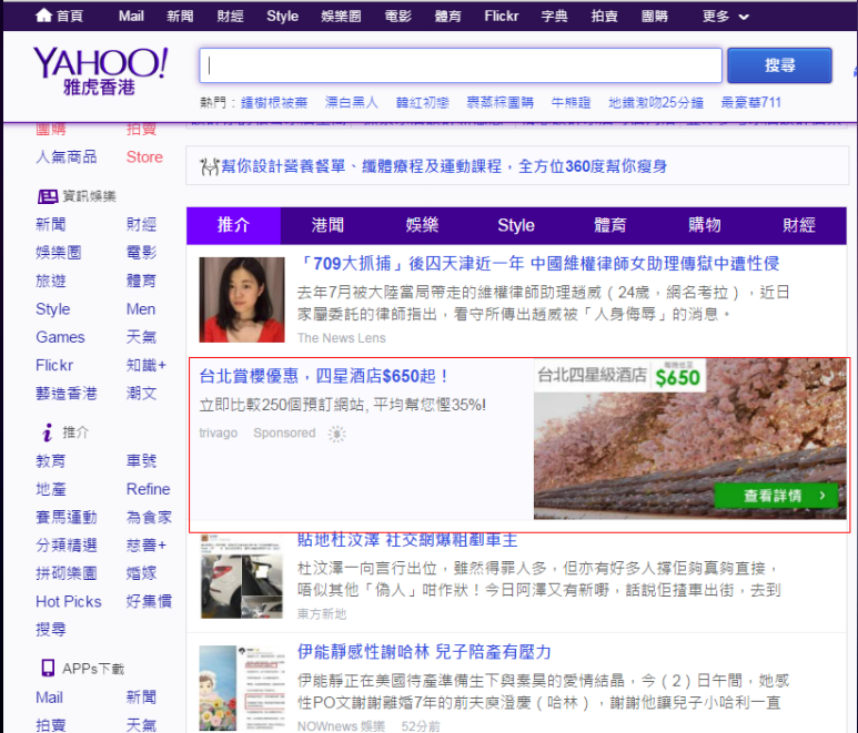 ②Yahoo網(wǎng)頁廣告:展示在資訊網(wǎng)頁界面,廣告信息直觀突出,用戶可以點(diǎn)擊進(jìn)入落地頁并選擇下載程序;
